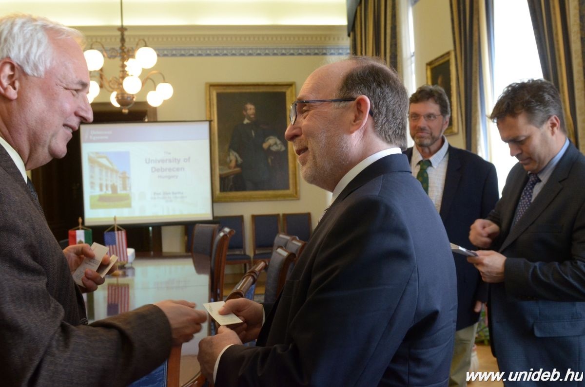 – A tervek szerint a hallgatók felváltva töltenének egy évet az Amerikai Egyesült Államokban és egy évet a Debreceni Egyetemen, így közös, kettős diplomát szerezhetnének. Ez a képzési forma egyébként nem ismeretlen előttünk, más felsőoktatási intézményekkel már eredményesen működik – mondta a tanácskozást követően Bartha Elek oktatási rektorhelyettes.