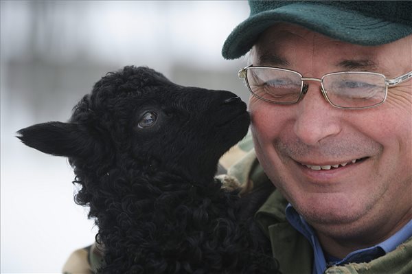 Fekete racka bárányt tart a kezében Demeter Ferenc telepvezető a hajdúböszörményi Hajdú-tanyán 2016. január 5-én. A karácsony másodnapján született bárány két világos színű racka utódaként jött a világra. MTI Fotó: Czeglédi Zsolt