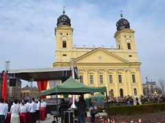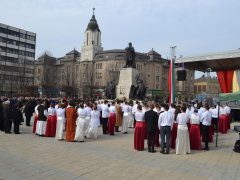 Hazám, hazám… címmel a cívisváros főterén 11 órakor kezdődött az ünnepi megemlékezés és koszorúzás. Az ünnepi műsorban többek között a Csokonai Színház művészei, az Ady Endre Gimnázium diákjai és a Debreceni Hajdú Táncegyüttes táncosai működtek közre.
