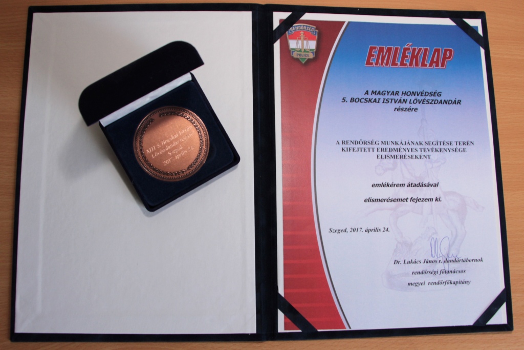 A Csongrád Megyei Rendőr-főkapitányság vezetője április végén emlékérmet adott az MH 5. Bocskai István Lövészdandárnak.