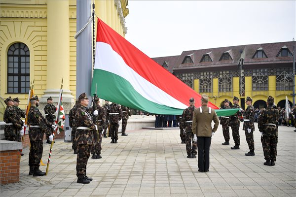 Katonai tiszteletadással felvonják Magyarország lobogóját az 1848-49-es forradalom és szabadságharc 170. évfordulója alkalmából rendezett ünnepség előtt a debreceni Kossuth téren 2018. március 15-én. Fotó: Czeglédi Zsolt / MTI