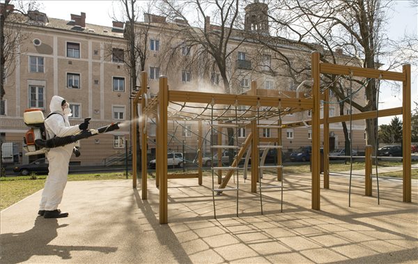 A győri Malomliget játszóterének eszközeit fertőtleníti a Győr-Szol Zrt. védőöltözetet viselő szakembere a koronavírus-járvány elleni védekezés részeként 2021. március 24-én.