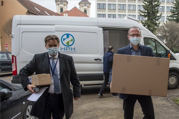 Pajtók Gábor kormánymegbízott (b) és Pozsgai Szabolcs Heves megyei tisztifőorvos az újonnan érkezett AstraZeneca koronavírus elleni vakcinákat hozza Egerben, a Heves Megyei Kormányhivatal udvarán 2021. április 15-én. MTI/Komka Péter