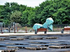 „Ezeken kívül 3 db filagória fog elkészülni, amelyekben ülőpadot, illetve mellette bográcsozóhelyiségeket helyezünk el. Itt szabadidős tevékenységeket lehet folytatni. Ami a leglátványosabb, az a vizesblokk épület lesz, mert az 70%-ban föld alatt lévő épület. Mondhatni föld felett építkezünk, de 40 cm vastagságú föld feltöltést fogunk készíteni rá, amelyből egy fa is ki fog nőni. Távolról tájba illő lesz, de közelről fogjuk látni, hogy egy vizesblokk, egy köztéri illemhely funkcióját fogja ellátni” – mondta Gyuris Norbert.