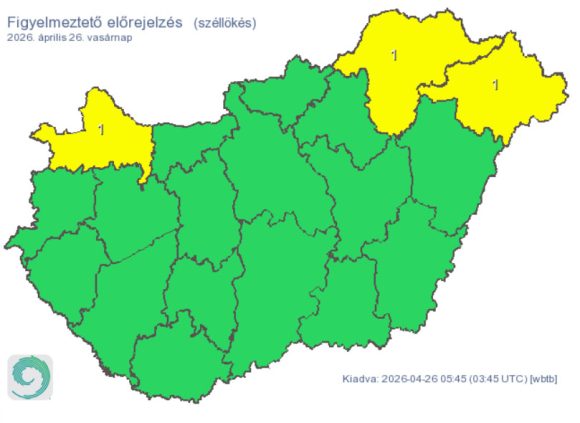 Ezért Borsod-Abaúj-Zemplén, Szabolcs-Szatmár Bereg és Győr-Moson-Sopron vármegyékben elsőfokú, citromsárga figyelmeztetés van érvényben széllökés veszélye miatt vasárnap éjfélig.