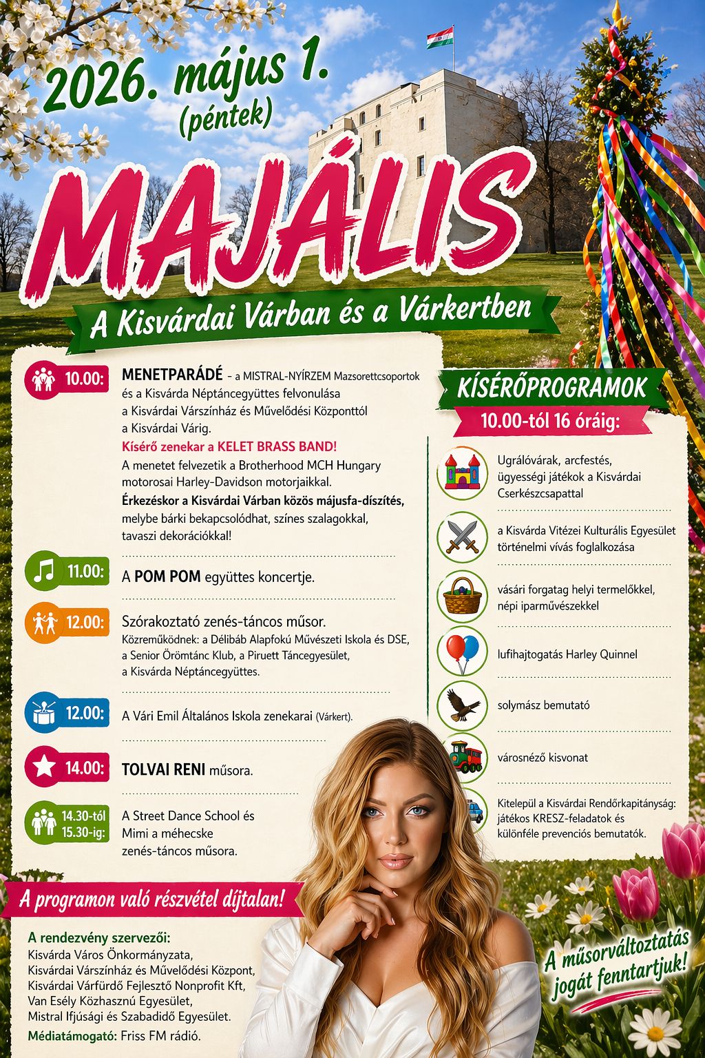 A majális azonban nemcsak a színpadi programokról szól: egész nap finom ételek, vendéglátás és vidámpark várja a családokat, baráti társaságokat és minden kikapcsolódni vágyót. A programok ingyenesen látogathatók, így bárki részese lehet ennek a közösségi élménynek.