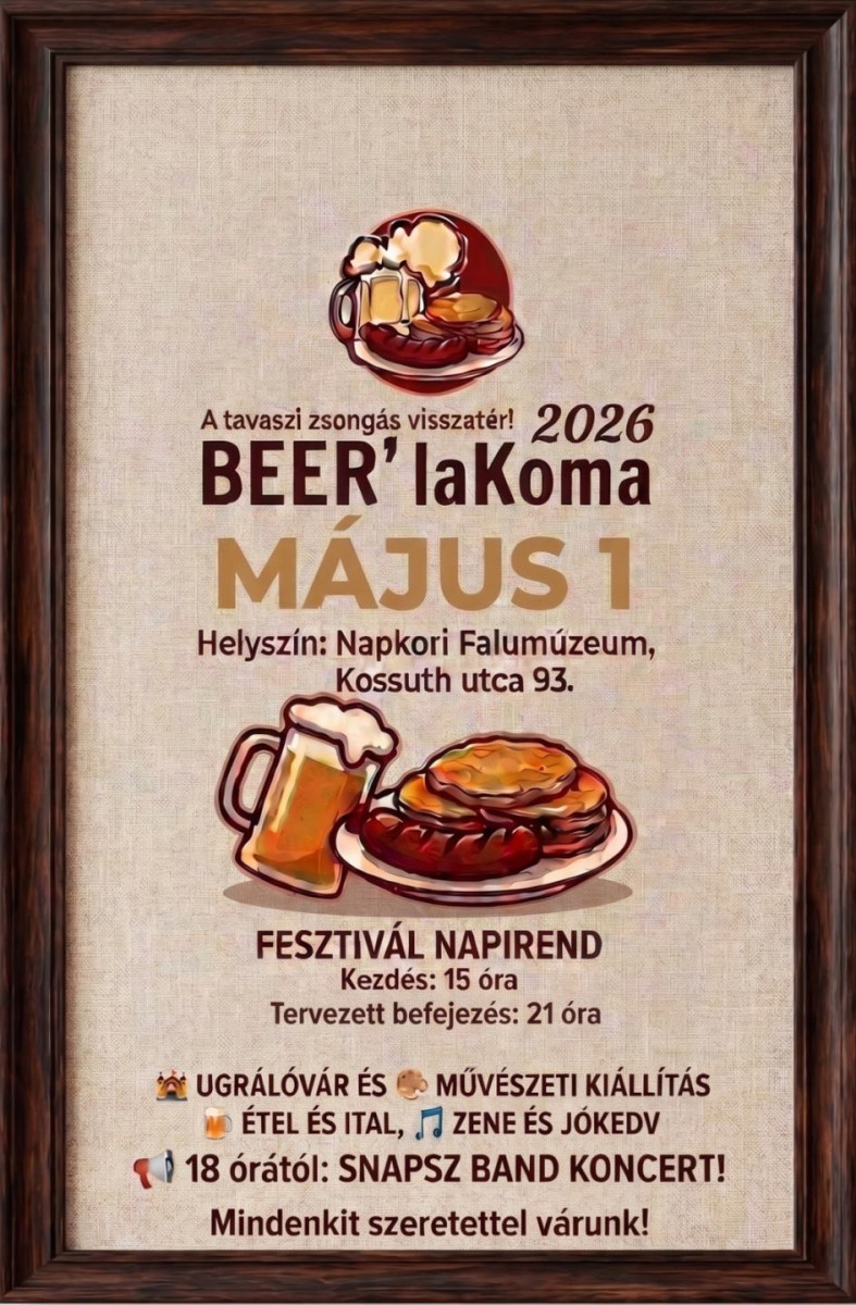 Május 1. + Sör + Lakoma = BEER’ laKoma! Idén a munka ünnepén nemcsak a pihenésé, hanem az ízeké is a főszerep Napkoron. Hideg sörökkel, sült kolbásszal és igazi közösségi élménnyel várunak mindenkit a Falumúzeumban.