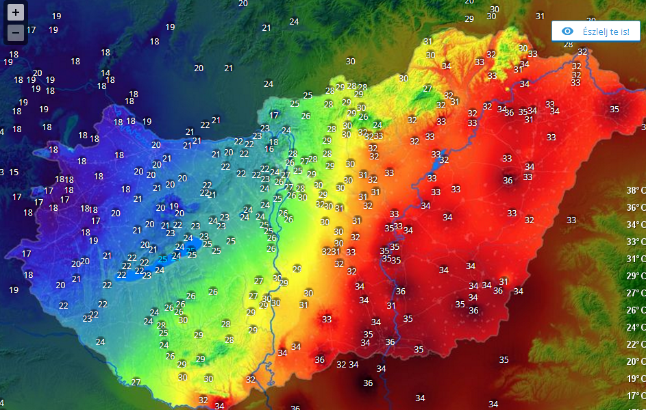 Szombaton 17:30 körül már 20 fokos különbségeket mérhetünk az ország keleti és nyugati szélei között.
