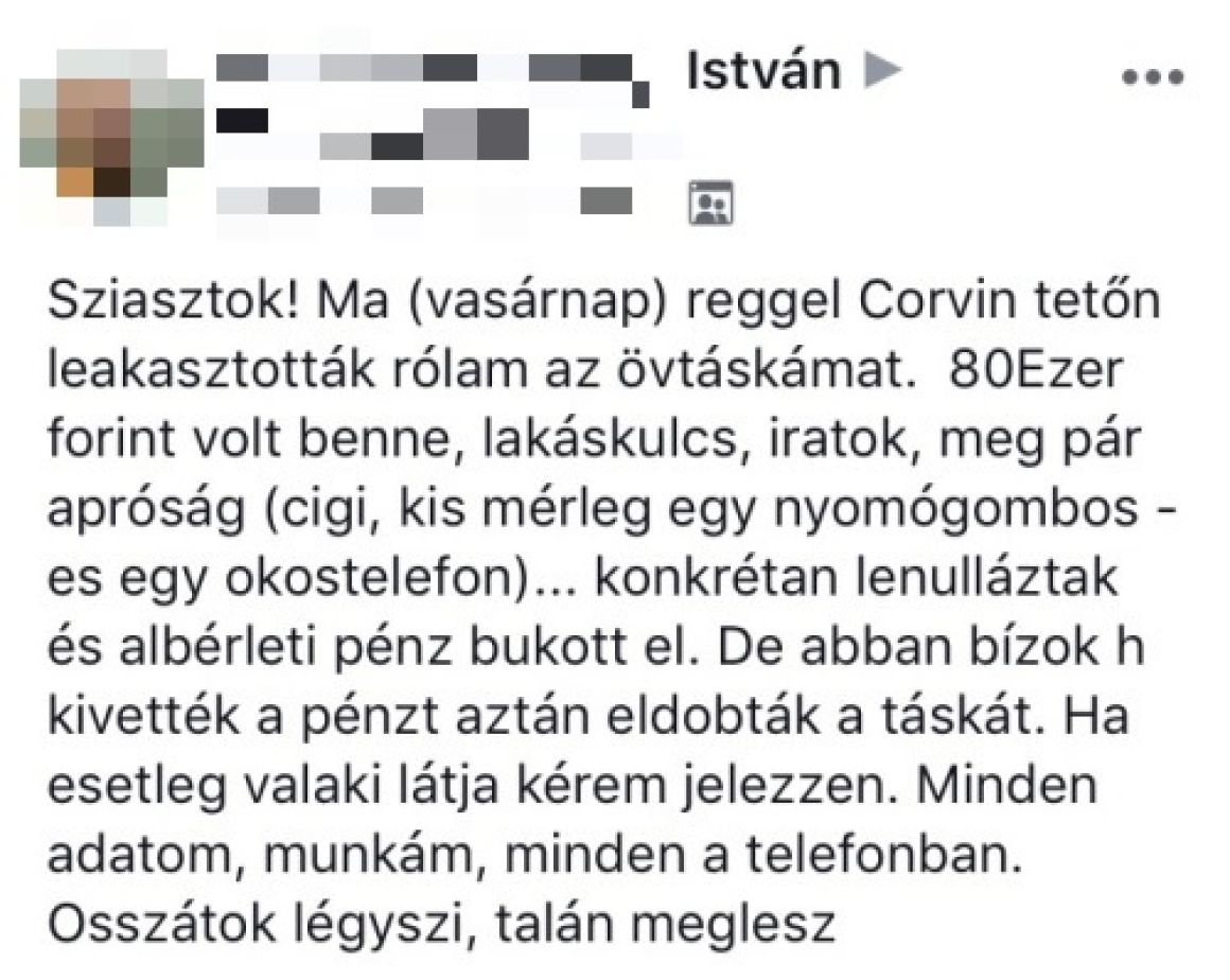 István azt írja, a Corvin tetőn lelopták róla az övtáskáját, benne 80 ezer forinttal, lakáskulccsal, iratokkal stb., de ami a legérdekesebb,