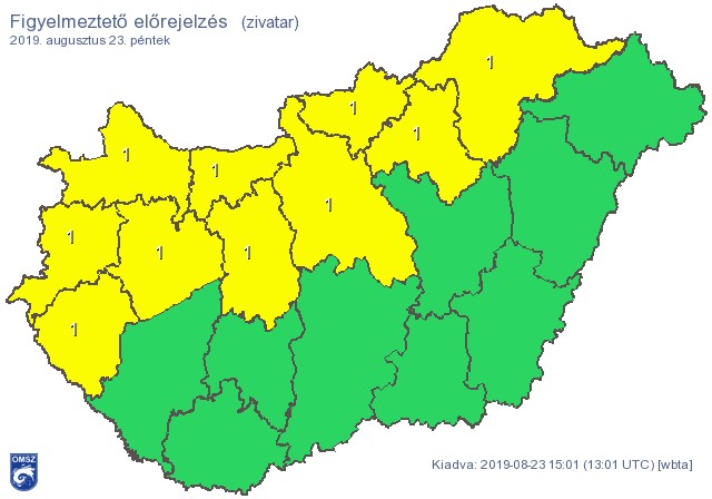 Az Országos Meteorológiai Szolgálat előrejelzése szerint pénteken az ország északi, északnyugati megyéiben többfelé kipattanhatnak zivatarok, melyeket átmeneti szélerősödés (45-60 km/h), intenzív csapadékhullás (10-20 mm) és esetleg kisebb szemű jég kísérhet.
