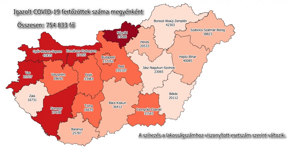 A kormányzati portálon azt írták: 754 833-ra nőtt a Magyarországon azonosított fertőzöttek száma. Az elhunytaké 25 580-ra, a gyógyultaké 461 181-re emelkedett.