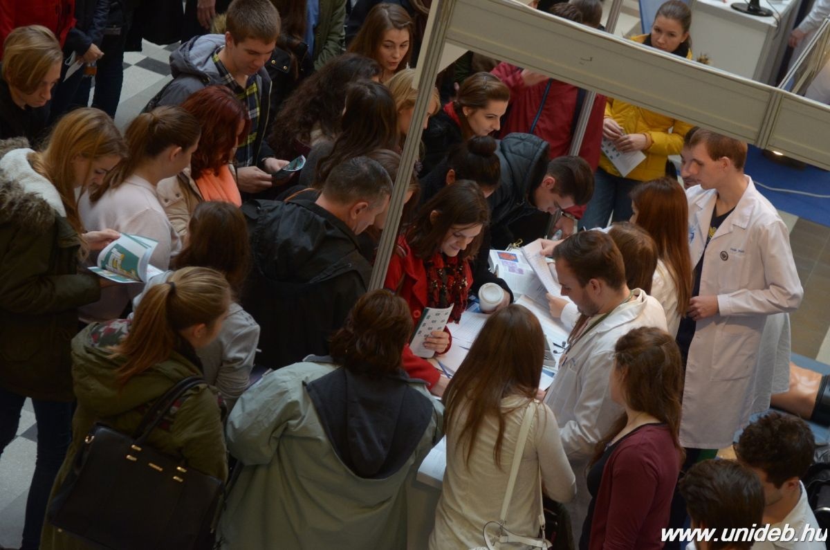 Zsúfolásig megtelt a Főépület Aulája szerda reggel a Debreceni Egyetem iránt érdeklődő diákokkal, akiket Bartha Elek oktatási rektorhelyettes köszöntött. Tájékoztatást adott az intézmény képzési kínálatáról, arról, hogy a magyar felsőoktatásban számon tartott képzési területekből egy kivételével valamennyin folyik képzés az egyetem 14 karán.