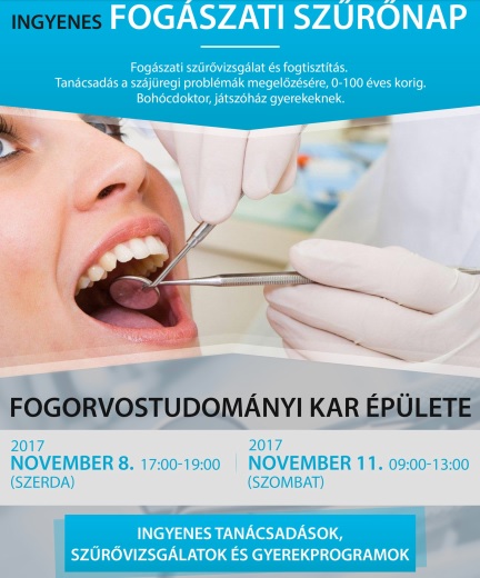 Ingyenes szűrőnap lesz a Fogorvostudományi Karon Egyetem Helyi hírek november 4, 2017Szabolcs SzilágyiSzóljon hozzá a Ingyenes szűrőnap lesz a Fogorvostudományi Karon bejegyzéshez Ingyenes tanácsokkal, szűrővizsgálatokkal, gyerekprogramokkal várják az érdeklődőket.