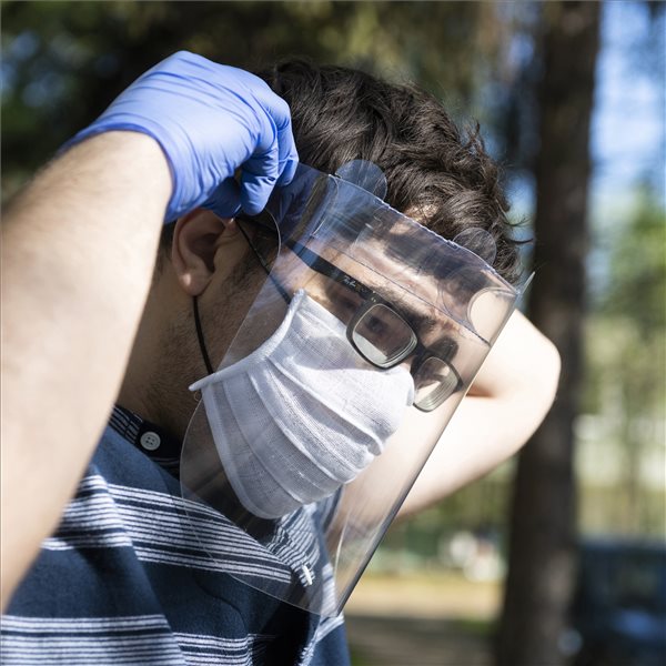 Koncz Gergő, a Color Pack Zrt. konstruktőre saját fejlesztésű arcpajzsát próbálja Nyíregyházán 2020. április 20-án. A koronavírus-járvány elleni védekezés részeként a nyomdaipari cég háromezer pajzsot adományoz a városi egészségügyi alapellátás és az önkormányzati szociális ellátórendszer dolgozóinak.