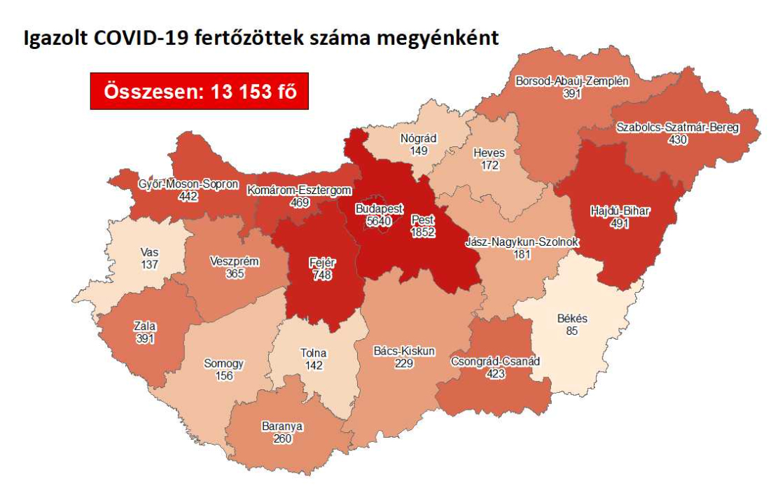 Magyarországon a fertőzöttek száma a mai adatok szerint 13 153 fő. Elhunyt öt idős, krónikus beteg, így az elhunytak száma 642 fő, 4117-en pedig már meggyógyultak. Az aktív fertőzöttek száma 8394 fő. Az aktív fertőzöttek 42%-a, az elhunytak 58%-a, a gyógyultak 42%-a budapesti. 287 koronavírusos beteget ápolnak kórházban, közülük 16-an vannak lélegeztetőgépen.