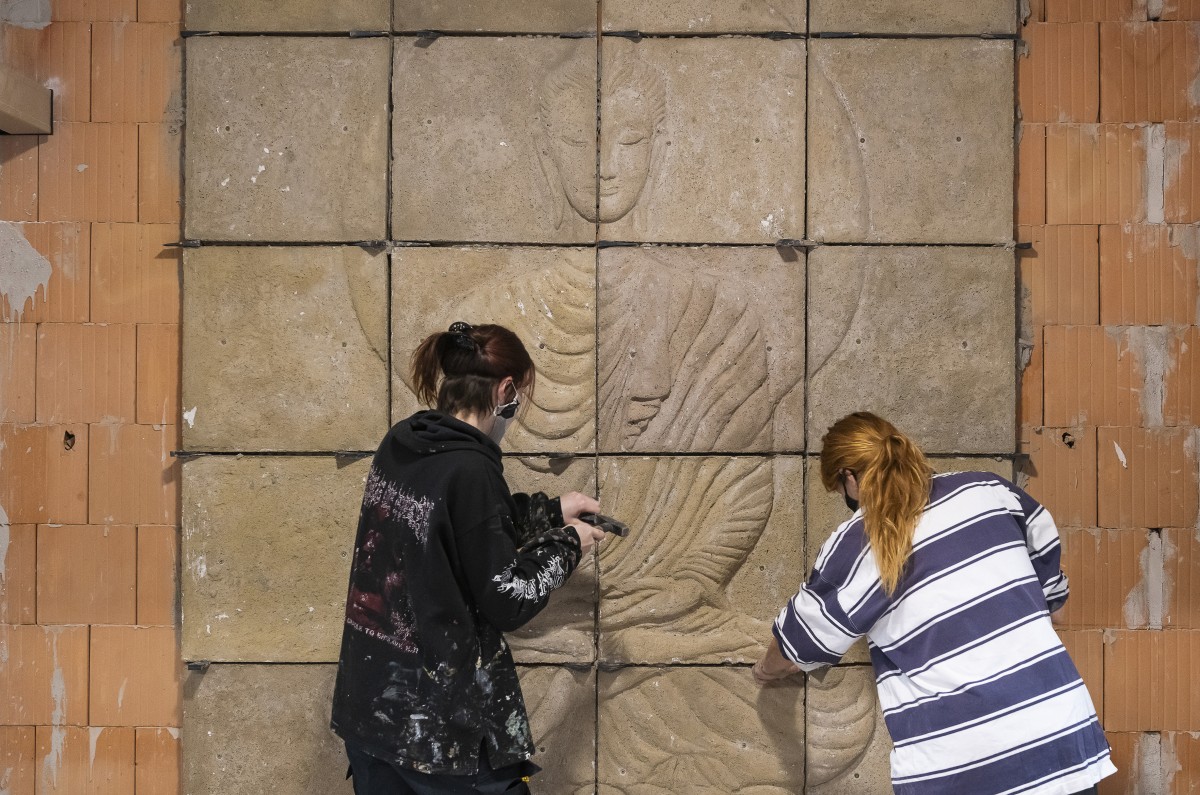A belső dekoráció kivitelezésén dolgozik Rakovics Borbála Luca jelmeztervező (balra) és Rakovics Klára grafikus a Nyíregyházi Állatpark új India-házában január 22-én.