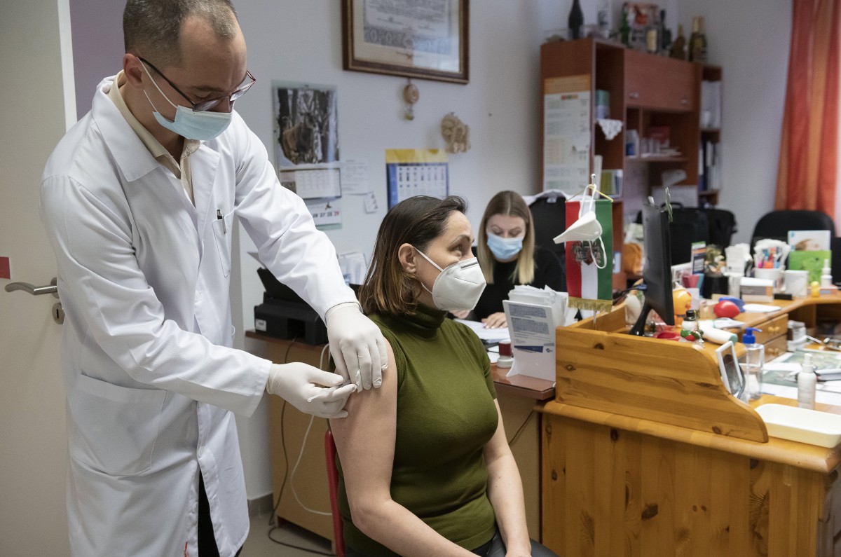 Kósa Péter háziorvos beolt egy nőt az AstraZeneca koronavírus elleni vakcina második adagjával tiszakóródi háziorvosi rendelőjében 2021. március 19-én.