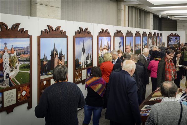 Érdeklődők Makovecz Imre Kossuth-díjas építész “..összekötni az eget és a földet..” című, a művész életművét reprezentáló tárlat megnyitóján a magyar kultúra napján a Kölcsey Központban, Debrecenben 2015. január 22-én. Fotó: Czeglédi Zsolt / MTI
