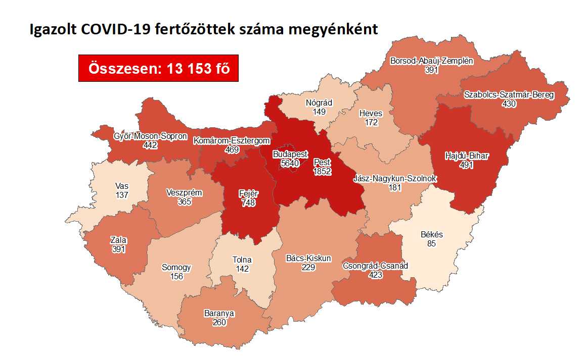 A kormányzati portálon azt írták: 13 153-ra nőtt a Magyarországon azonosított fertőzöttek száma. Az elhunytak száma 642-ra emelkedett, 4117-en már meggyógyultak.
